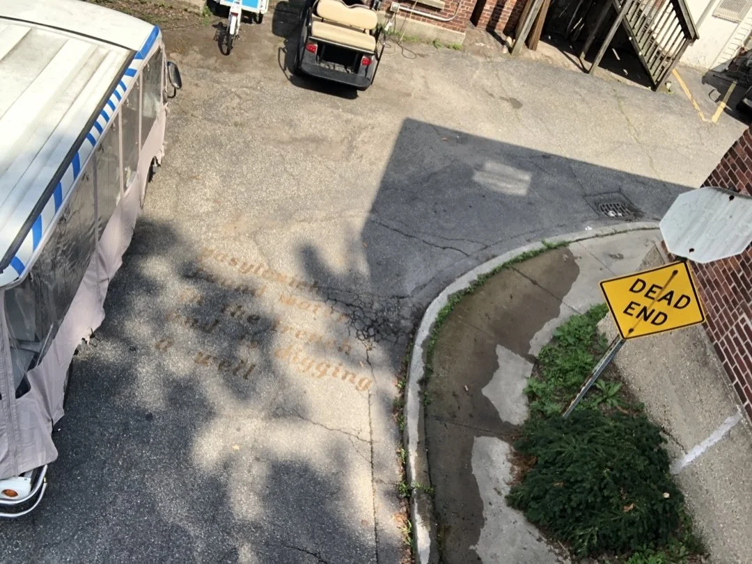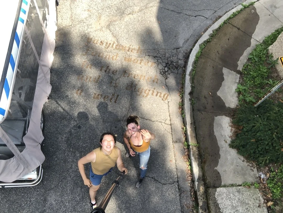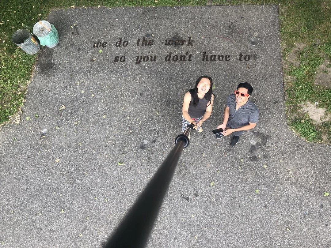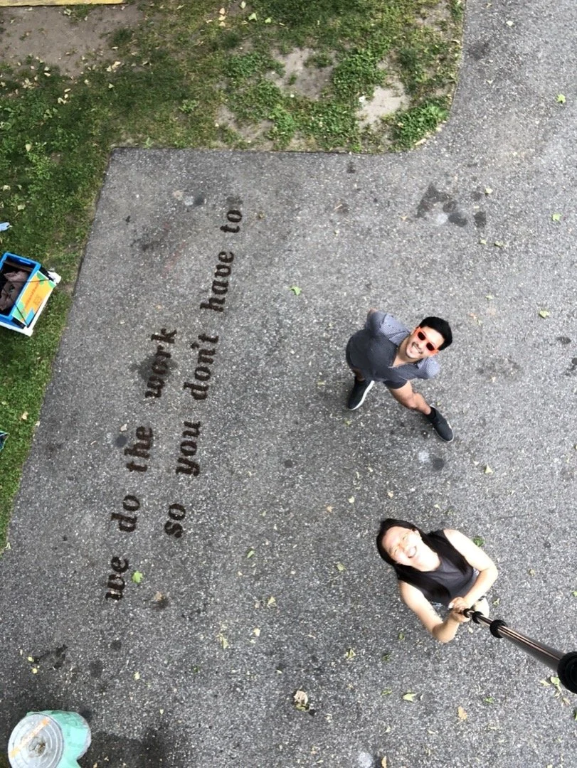 Mew chose the phrase “Your art will save your life” from Weihui. Similar to Weihui, Mew tried other jobs before becoming an artist. He studied Landscape Architecture in college, yet later on decided upon a career in making and creating. He considers art as something consistent in his life. “I might get bored in different jobs, but never with art”. Mew also just finished reading the book “Your art will save your life”, thus feel deeply connected to this phrase.We laid out the stencils on gravel by the sightseeing platform. The wind on the hill was strong. The sun was right in our eyes when we looked up.